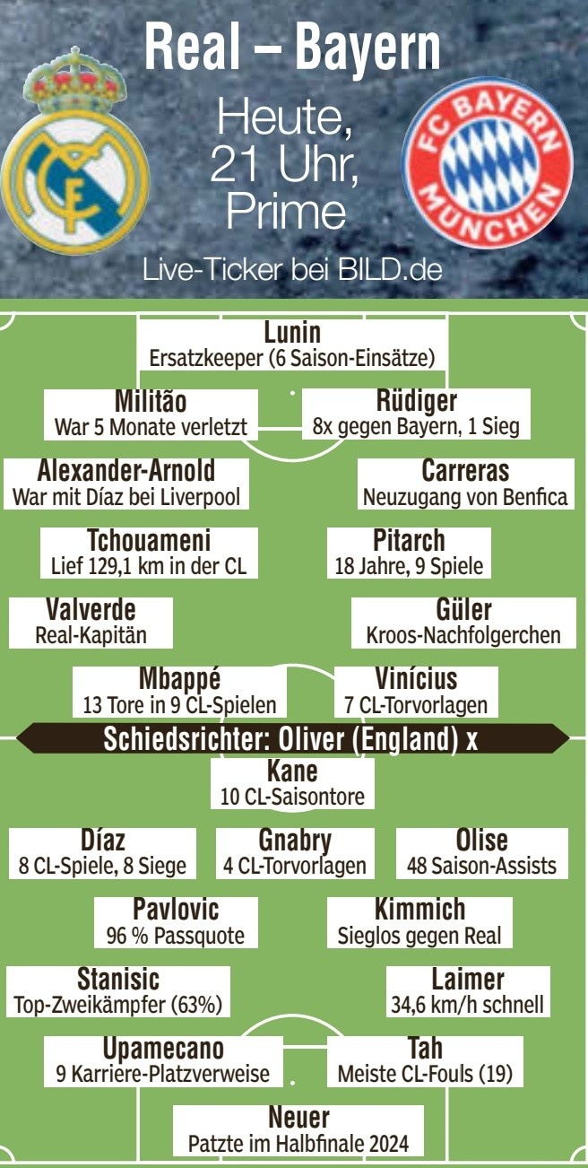 零点吧足球4月7日讯 皇马将在本轮欧冠八强战首回合主场迎战拜仁,《图片报》也预测了双方首发阵容。