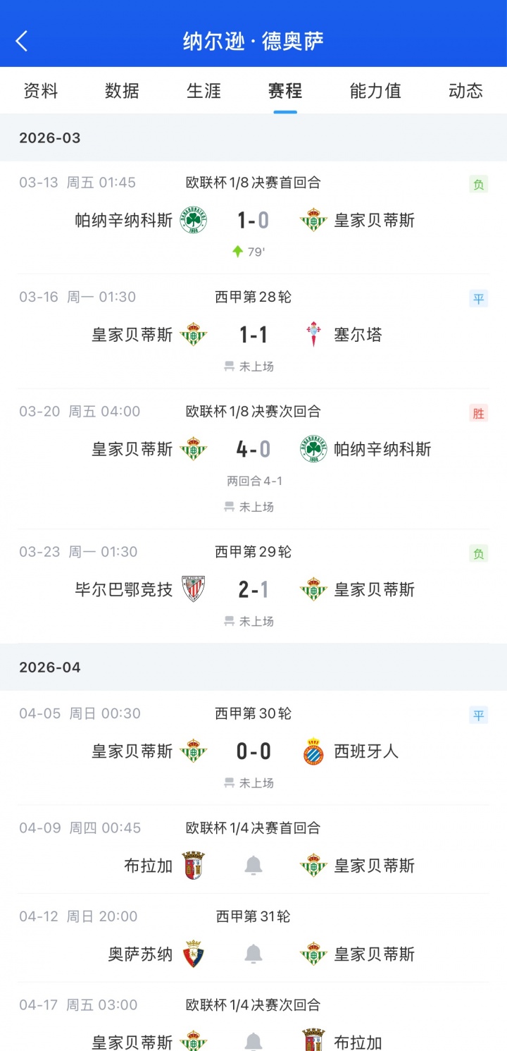哥伦比亚中场纳尔逊·德奥萨最近4场比赛都进入了贝蒂斯的比赛名单,但1分钟都没上,连续4场枯坐替补席。下场欧联杯1/4决赛首回合,德奥萨继续入选了大名单。