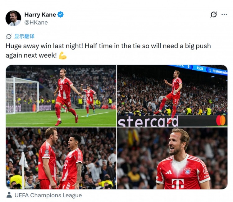 凯恩社媒晒出比赛照片,并写道:“昨晚取得重要的客场胜利!这只是两回合淘汰赛的上半场,下周需要再次奋力拼搏!”