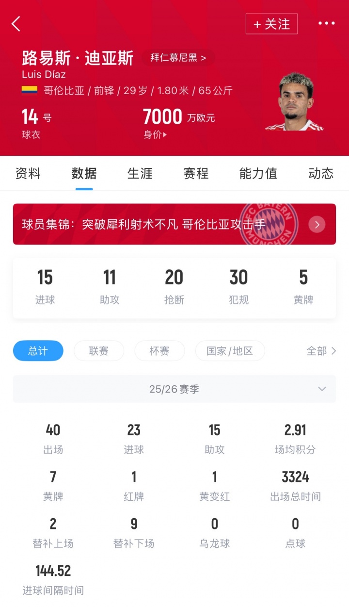 报道称,迪亚斯在采访中表示:“决定加盟拜仁是正确的选择。我真的很开心,享受每一场比赛。我感觉很棒,状态很好,这意味着我已经准备好帮助球队了。