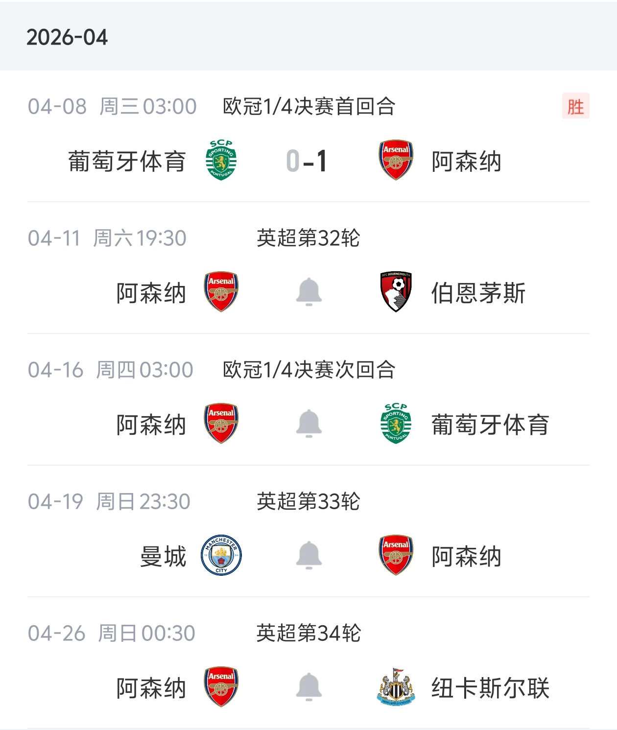 阿森纳的下一场比赛是北京时间4月11日19:30主场迎战伯恩茅斯的英超联赛。目前阿森纳积70分,领先少赛一轮的第二名曼城9分。