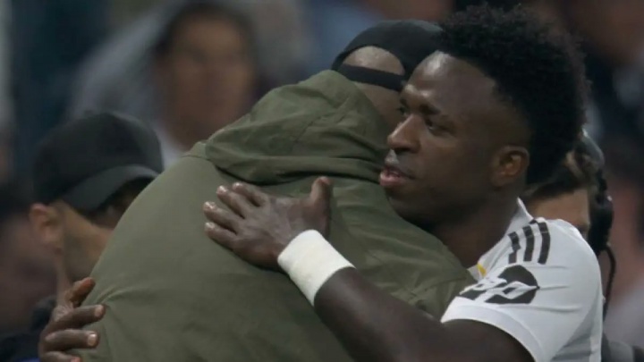 曾就歧视事件公开声援!维尼修斯中场时主动找孔帕尼拥抱致意