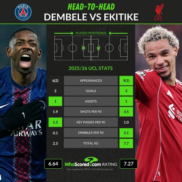 本赛季欧冠关键数据:登贝莱8场2球1助攻,埃基蒂克10场3球1助攻
