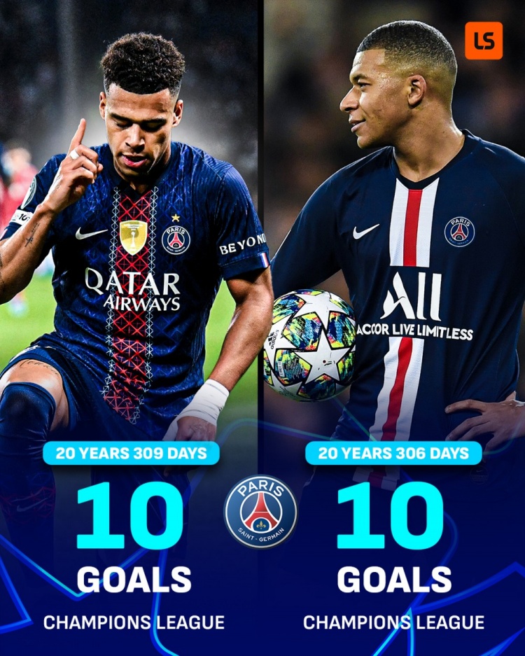 姆巴佩是在20岁306天时为巴黎在欧冠打进10球,杜埃则是20岁309天。