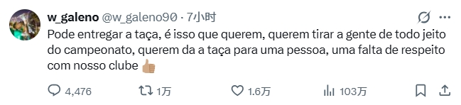 加莱诺写道:把奖杯给他们吧,这就是他们想要的,他们不惜一切想把我们从联赛竞争中踢出去,想把奖杯送给某个人,这完全是对我们俱乐部的不尊重。