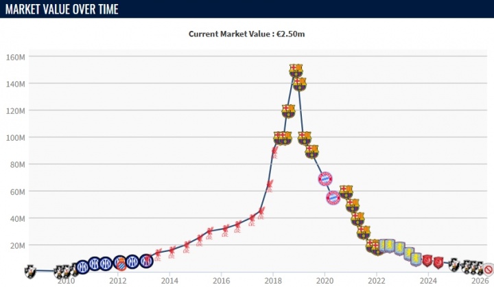 库蒂尼奥在2018年时以1.35亿欧转会费从利物浦加盟巴萨。2018年,26岁的库蒂尼奥巅峰身价高达1.5亿欧,但随后由于表现不佳,他的身价遭遇断崖下滑。此后他接连效力拜仁、维拉、杜海勒和瓦斯科达迦马,均没能拿出很好的表现。