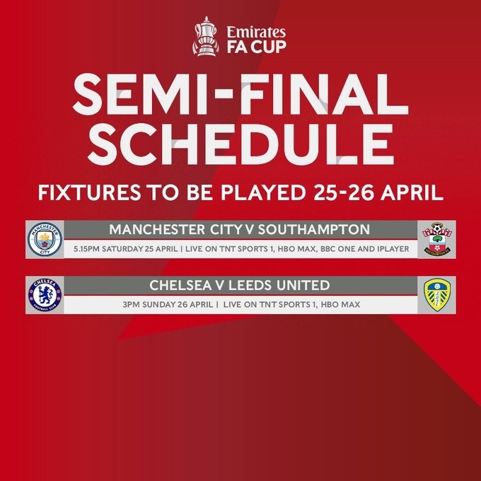 零点吧足球4月9日讯 足总杯两场半决赛时间已经敲定,曼城和切尔西都将出战。