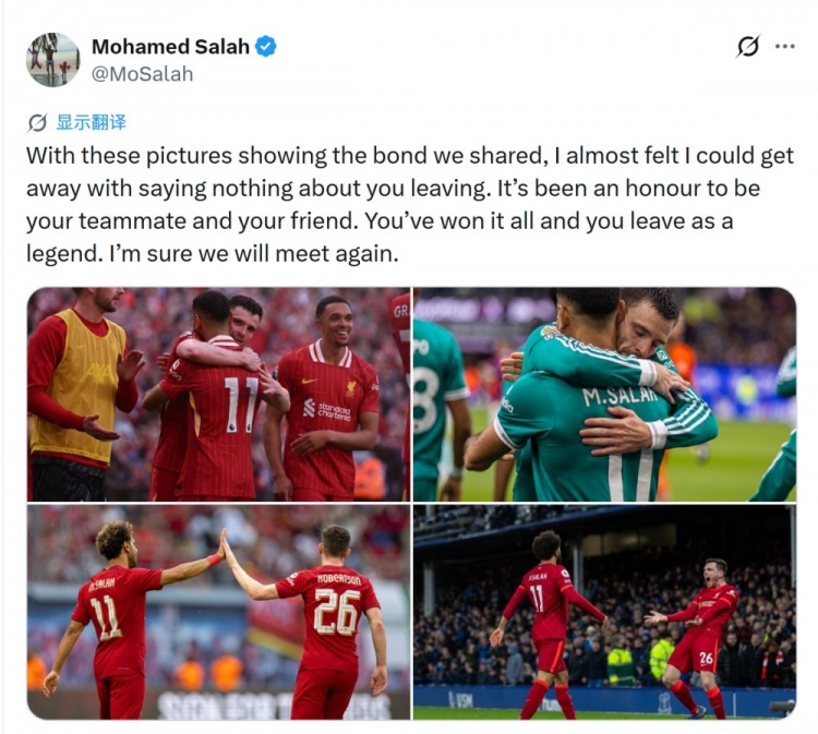 萨拉赫社媒晒出与罗伯逊的合照,配文:“看着这些记录我们深厚情谊的照片,我甚至觉得即便对你的离队只字不提也无妨。能成为你的队友和朋友,是我的荣幸。你已赢得一切,并以传奇之姿离去。我相信我们定会再次相逢。”