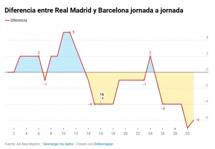 不用追溯太久,就能看到皇马位居榜首的画面:就在7轮之前,巴萨客场不敌赫罗纳,而阿韦洛亚的球队战胜皇家社会后,皇马重夺榜首。当时联赛已打完近三分之二,西甲冠军似乎已是皇马囊中之物。这是8周前的景象。