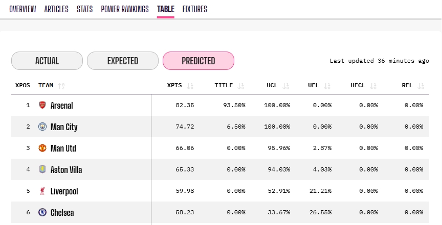 零点吧足球04月11日讯 英超第32轮,阿森纳爆冷1-2不敌伯恩茅斯,先赛2场领先9分。根据opta的夺冠概率预测,阿森纳依旧有93.5%的概率夺冠,相较于上轮下降了4.1个百分点。