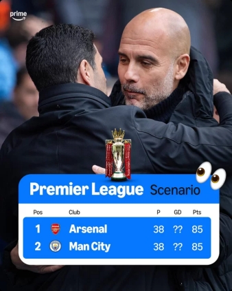 转播方亚马逊列出一种潜在的英超争冠形势:若曼城接下来在英超全胜(包括主场对枪手的直接对话),而阿森纳赢得除直接对话的另外五轮比赛,双方在全部比赛结束后的比分均为85分,需要比较净胜球才能决定最终冠军归属。