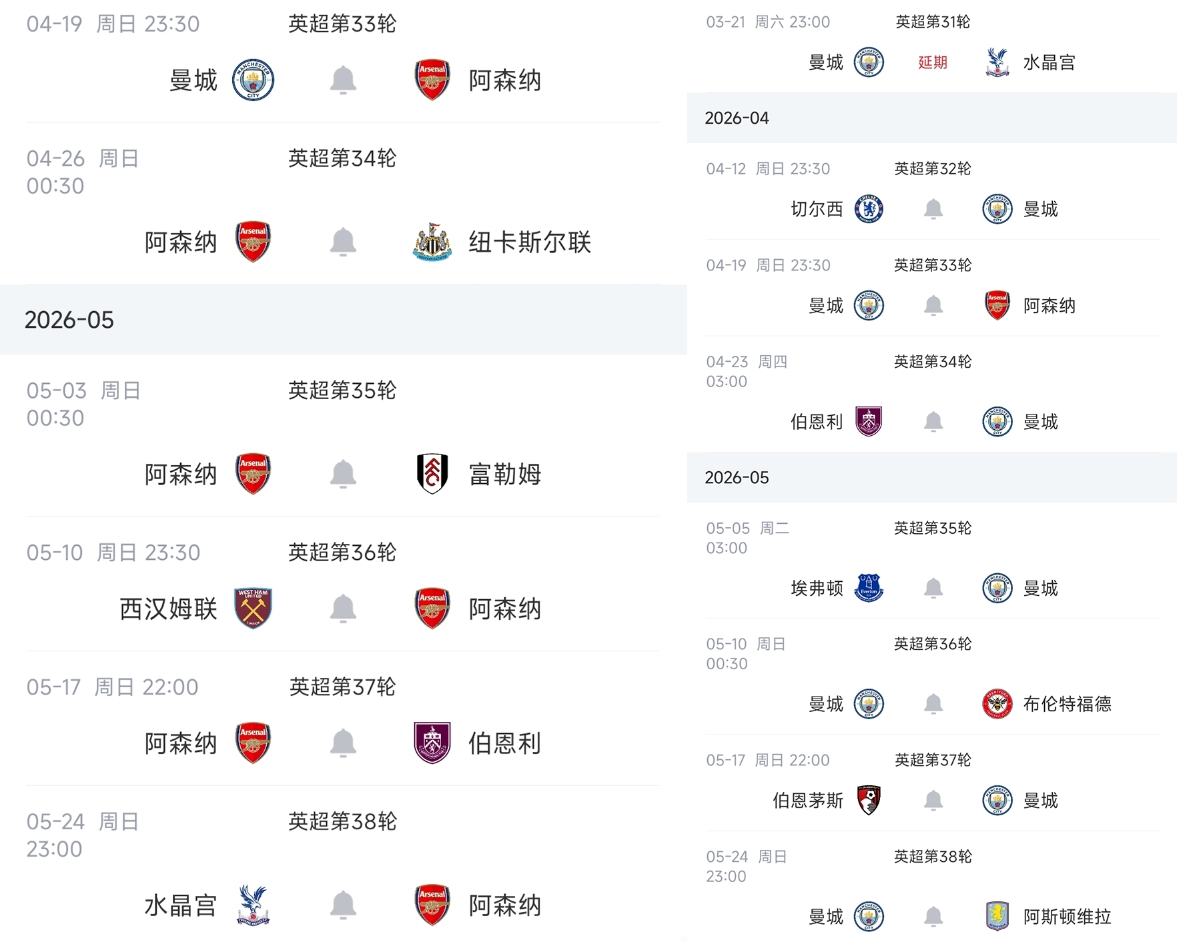 曼城英超剩余赛程: