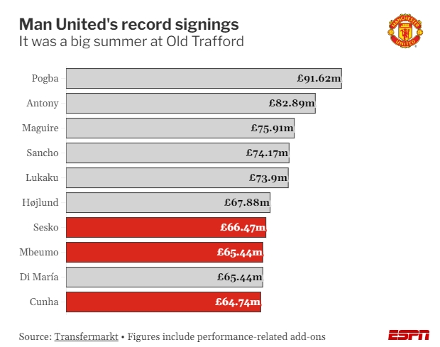 ESPN根据德转信息列出的曼联队史转会纪录