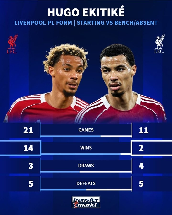零点吧足球4月12日讯 利物浦在本轮英超安排埃基蒂克替补的情况下,最终2-0击败富勒姆。《转会市场》也对比了后者本赛季首发与否情况下的利物浦英超战绩。