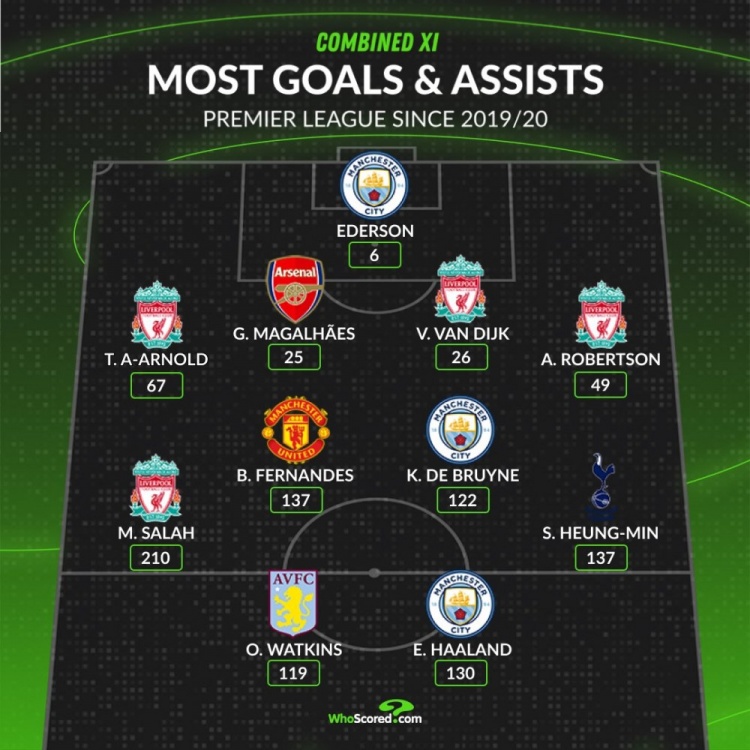 零点吧足球4月14日讯 whoscored统计了2019-20赛季以来的英超直接参与进球最多阵容,利物浦4将、曼城3人。