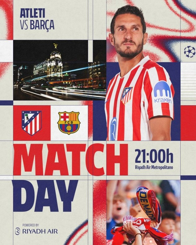 马竞官推配文写道:“今晚让我们在主场万众一心!”海报中是队长科克单人出镜。马竞在首回合客场2-0击败巴萨占据优势。
