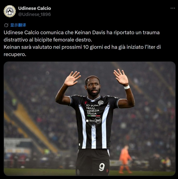 乌迪内斯发布医疗公告,确认凯南·戴维斯右大腿股二头肌出现牵拉伤。球员将在未来10天内接受进一步评估,目前他已经开始进行康复治疗。