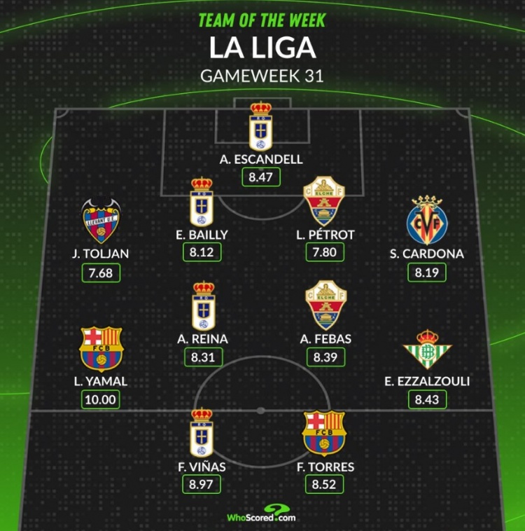 零点吧足球4月14日讯 西甲第31轮战罢,数据网站Whoscored也评选出本轮比赛评分最高阵容,其中亚马尔满分10分领衔,具体如下:
