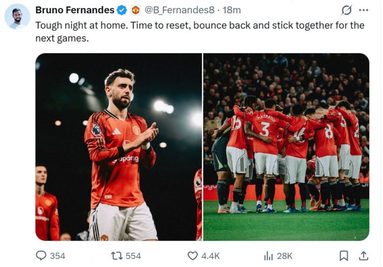 本场比赛B费送出精彩助攻帮助卡塞米罗破门,他也在个人社媒晒出本场照片鼓励球队,写道:“主场经历一场艰难的失利,现在是时候进行休整,我们会在下一场比赛团结一致重振旗鼓。”