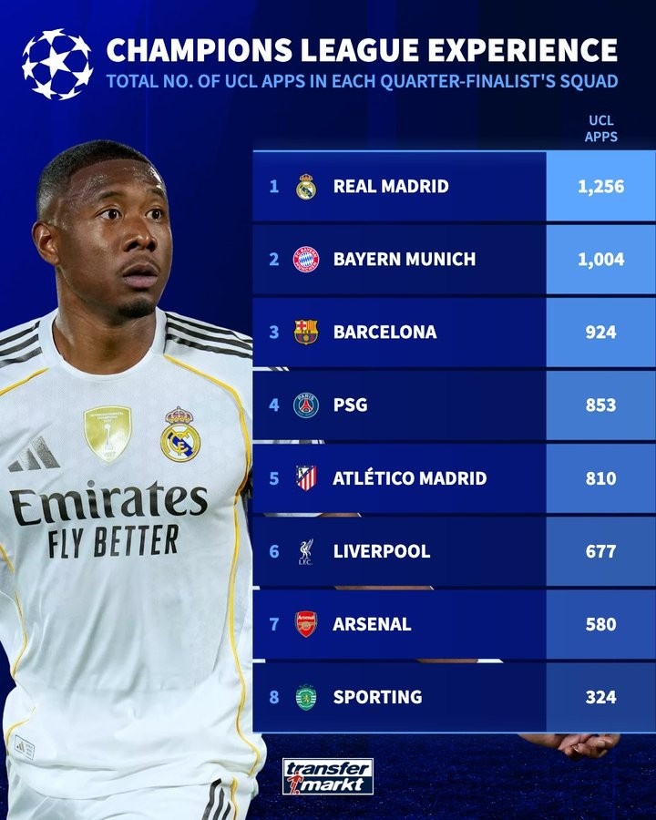 零点吧足球4月15日讯 欧冠八强战将战火重燃,《转会市场》也列出了当前各队阵容中的总欧冠出场次数情况,皇马、拜仁、巴萨列前三。