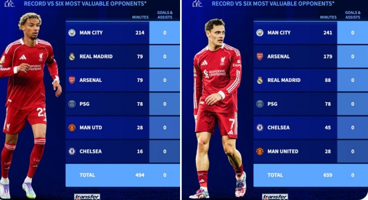 德转数据统计显示,本赛季代表利物浦出战身价最高的6个对手(曼城、皇马、巴黎、阿森纳、曼联、切尔西),维尔茨(共计659分钟)和埃基蒂克(共计494分钟)仅收获0球0助攻: