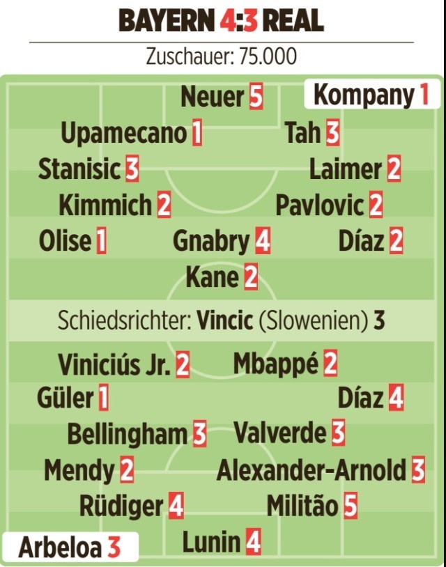 图片报评分:于帕、居莱尔1分 姆巴佩2分 诺伊尔5分 卡马文加6分