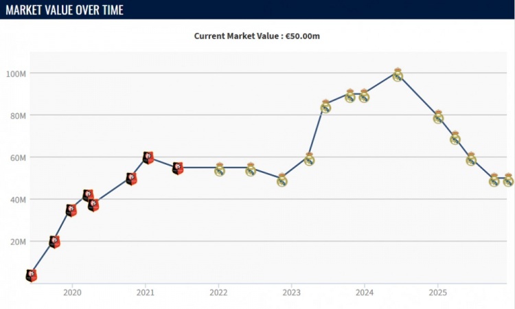 卡马文加的表现下滑,还体现在他的身价上。23岁本应是球员上升期,但是2年来卡马文加身价持续下跌,如今仅剩5000万欧。2024年夏天,21岁的卡马文加身价一度高达1亿欧。