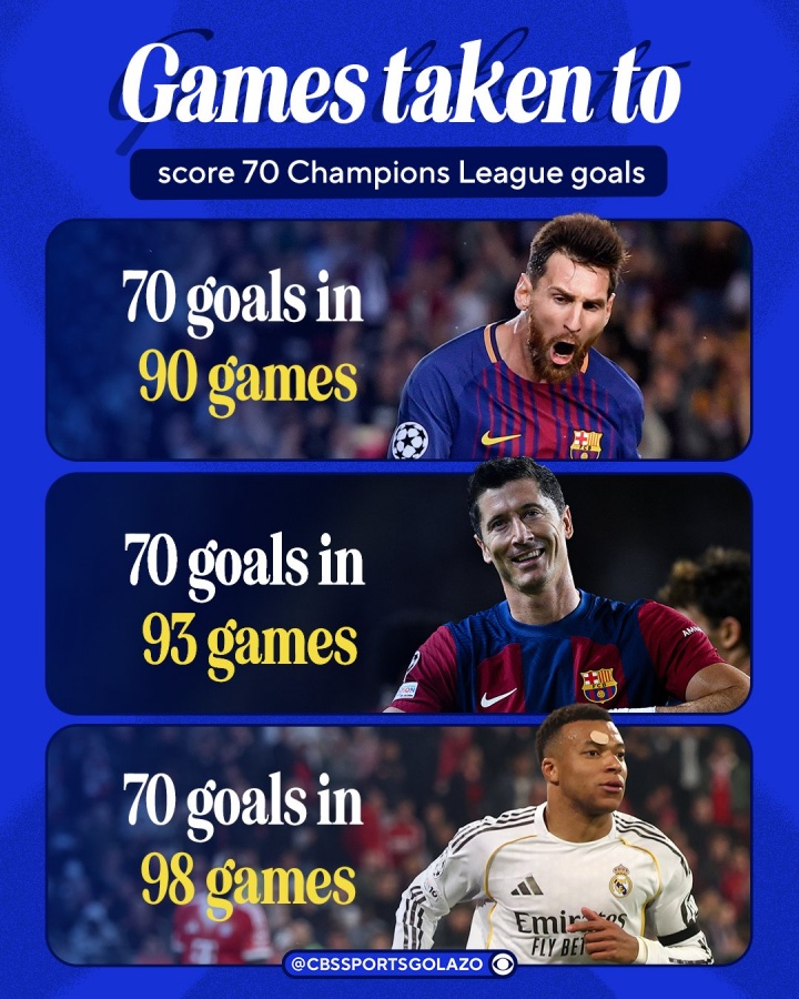 CBS体育晒图,统计打进欧冠70球的球员用时场次。其中梅西90场70球历史最快,莱万93场70球第二,姆巴佩98场70球第三。