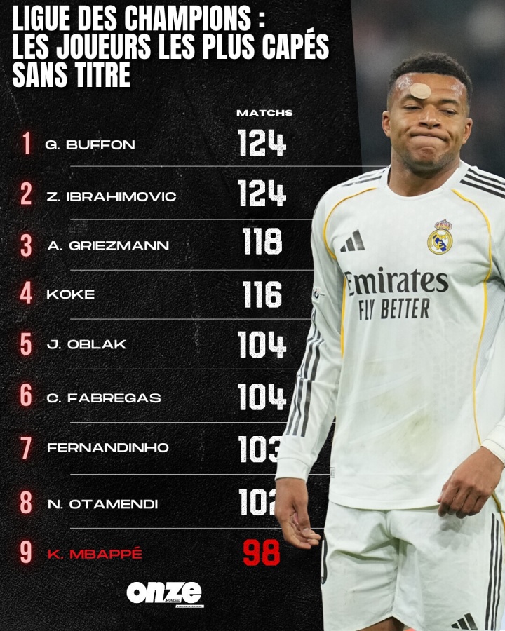 零点吧足球04月16日讯 外媒《Onze Mondial》统计了未曾夺得欧冠冠军的球员中,这些球员的欧冠出场次数排行,姆巴佩98场排在历史第9位。布冯、伊布124场并列第一。