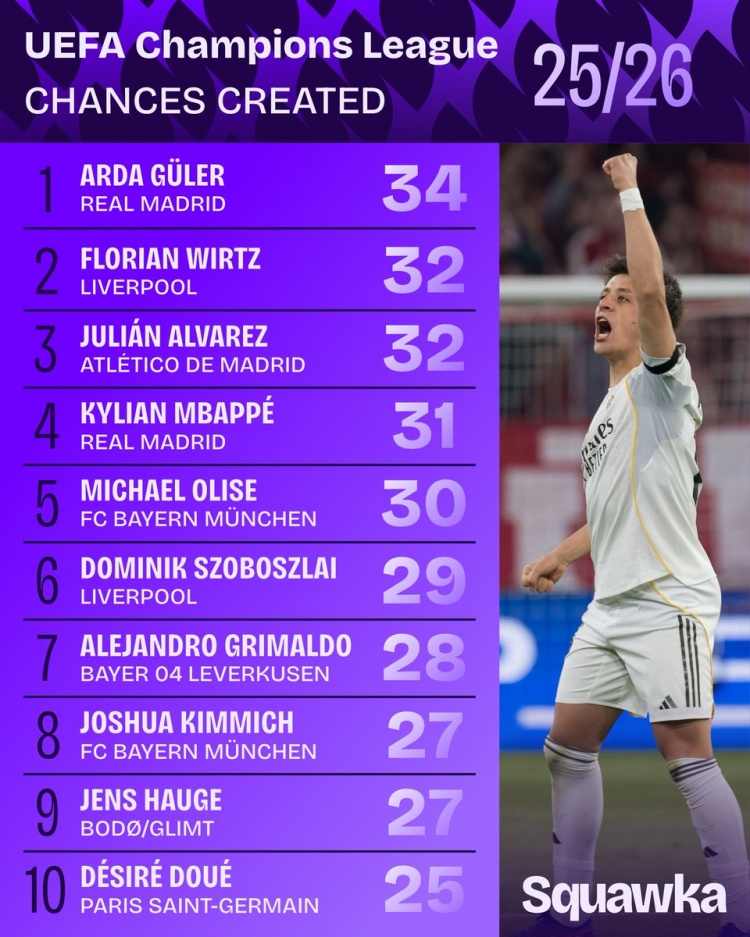 本赛季欧冠创造机会排名: