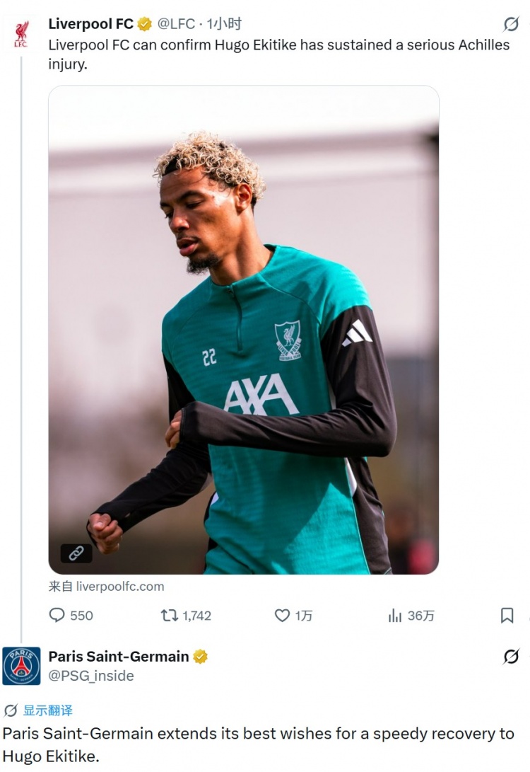 巴黎俱乐部官方社媒为利物浦公告留言:“巴黎圣日耳曼向埃基蒂克致以最诚挚的祝福,祝他早日康复。”