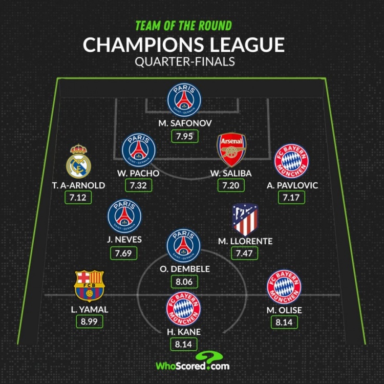 零点吧足球4月16日讯 欧冠八强战已经完赛,whoscored也列出了本轮评分最佳阵容,巴黎4将、拜仁3人。