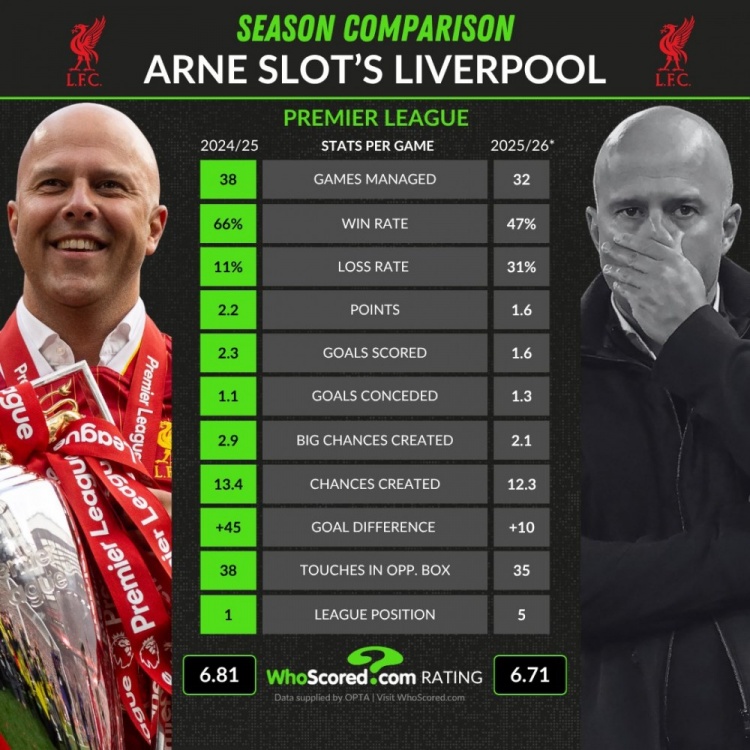 零点吧足球4月17日讯 利物浦在本赛季表现明显下滑,whoscored也对比了斯洛特带队两赛季英超的关键数据: