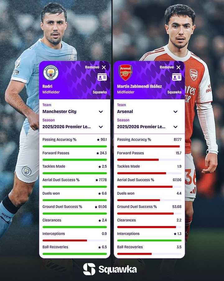 本赛季英超场均关键数据对比:罗德里全面占优,苏维门迪拦截更多