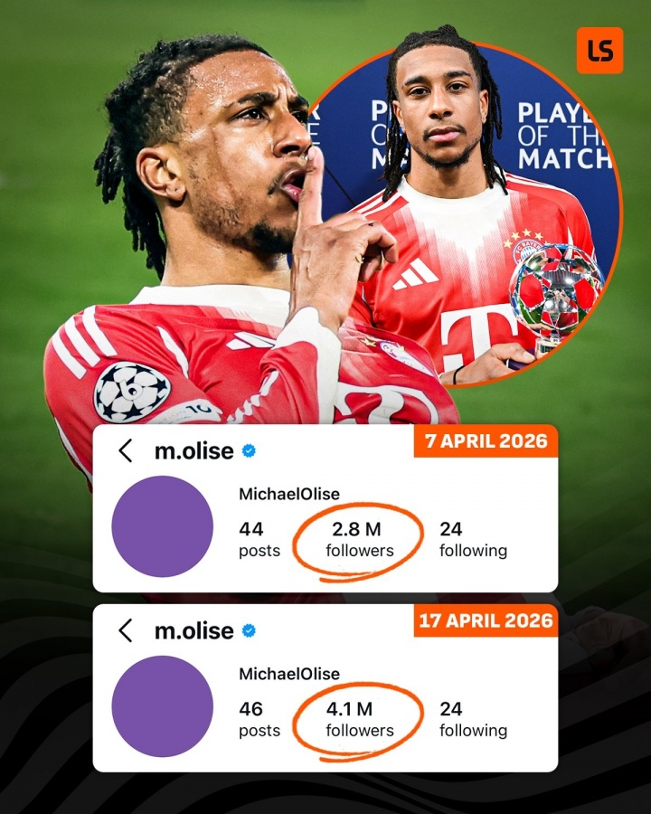 在4月7日战皇马前,奥利塞Ins粉丝280万,而截止今天,奥利塞Ins粉丝数上升至410万。
