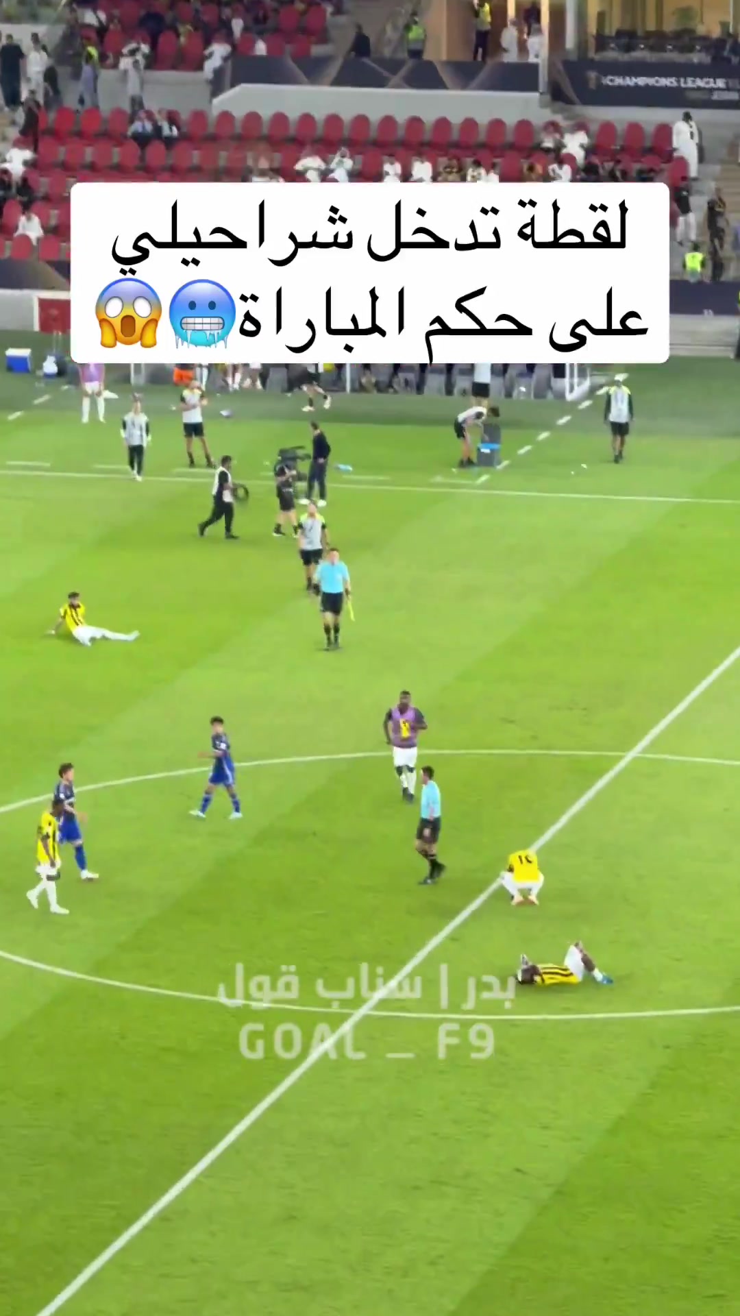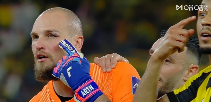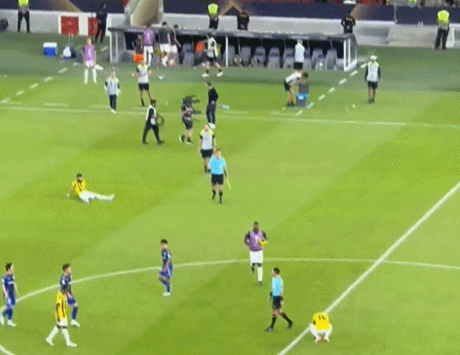 哨响之后,一段在推特广为流传的视频显示,吉达联20号后卫艾哈迈德·沙拉赫利冲进球场愤怒靠近马宁,冲撞马宁,被马宁直接出示红牌。