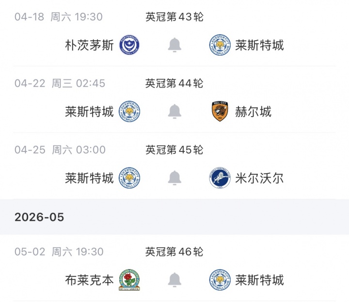 莱斯特城剩余赛程: