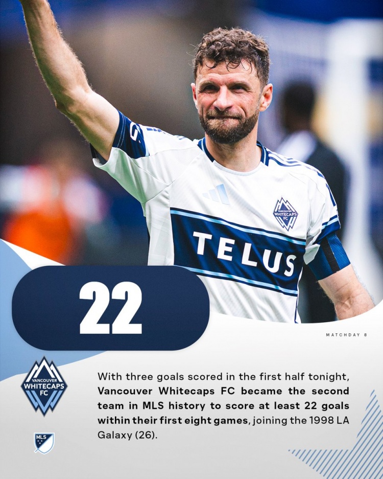 温哥华白浪本赛季前8场美职联比赛打进22球,成为美职联历史第二支赛季前8场比赛进球22+的球队,首支是1998年洛杉矶银河(26球)。
