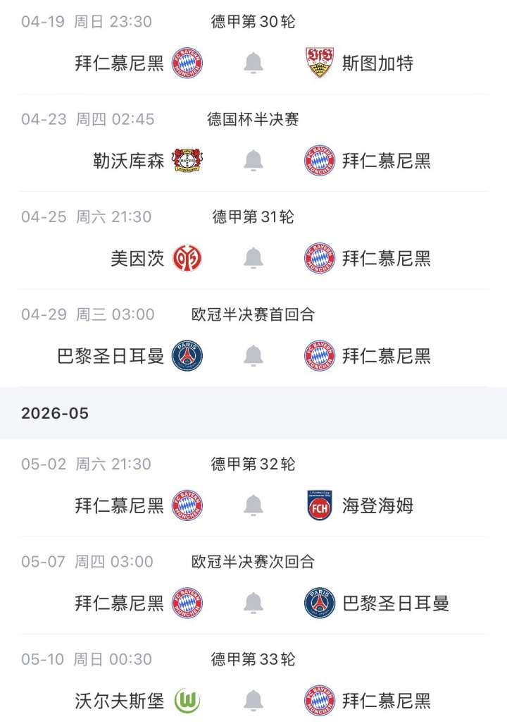 拜仁未来赛程: