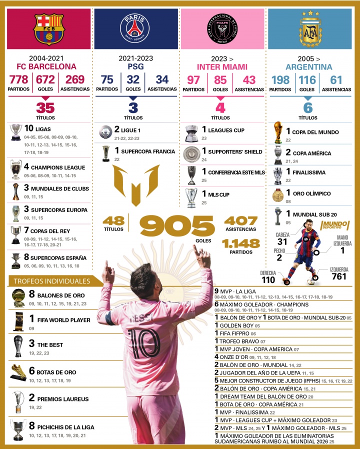1148场905球407助,制造进球1312球,拿下48冠。其中迈阿密生涯97场85球43助,拿下4冠。