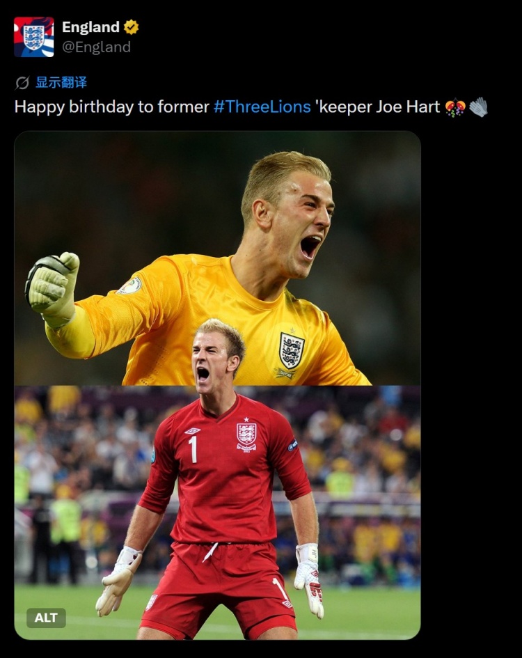 英格兰队官方社媒晒出乔·哈特效力时期的照片,配文:“祝前三狮军团门将乔·哈特生日快乐。”