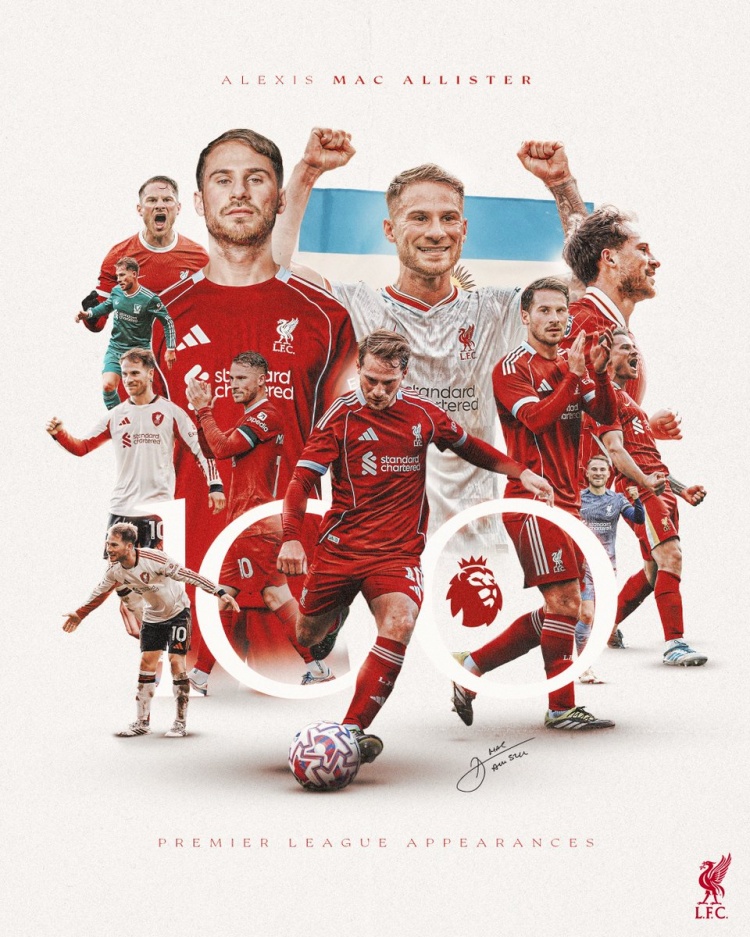 此役是麦卡利斯特为利物浦出战的第100场英超比赛,利物浦官方社媒晒出海报,祝贺他达成里程碑。