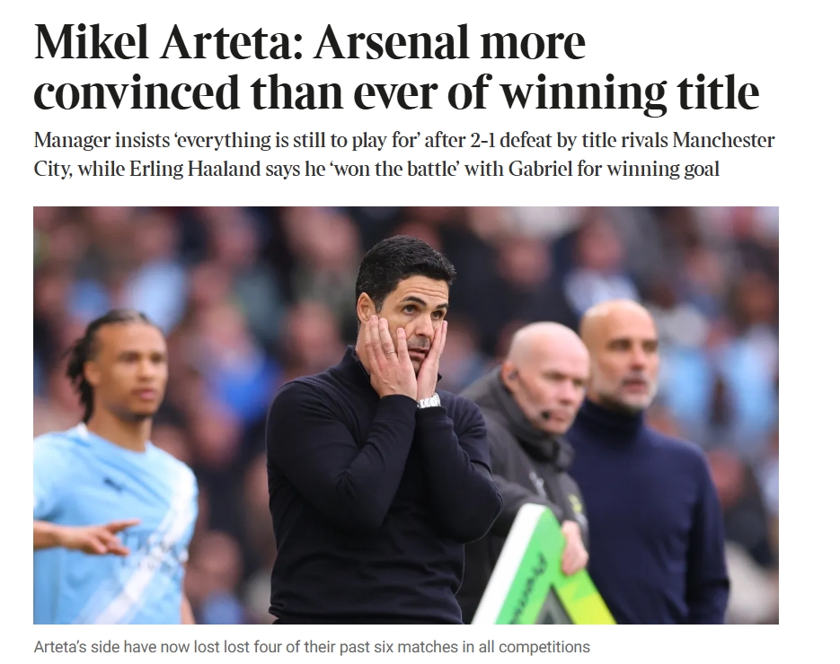 零点吧足球04月20日讯 阿森纳1-2不敌曼城,赛后阿尔特塔被问到对夺得英超冠军的信念,他的回答登上了各大媒体的头条。