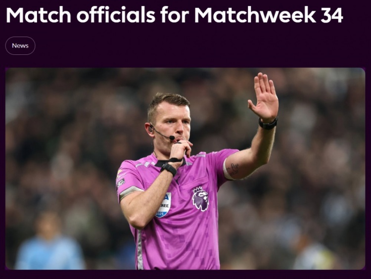 英超第34轮裁判:巴罗特执法阿森纳vs纽卡,安迪·马德利执法曼城
