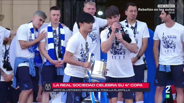 皇家社会举办了夺冠游行和庆典,久保建英在庆祝活动中用西语发言,他说道:“我不太喜欢多说话,我更喜欢在球场上用表现说话。不过,我觉得今天是我人生中最美好的一天,我们要好好狂欢一番,感谢大家。”