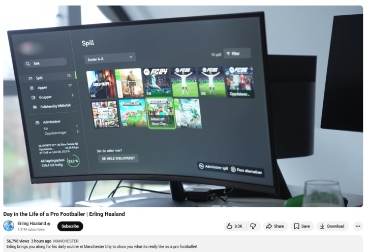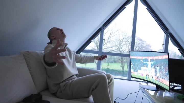 在VLOG中,哈兰德玩游戏FC26(改名前为FIFA),并在游戏中操纵曼城,哈兰德用“自己”打入两球,并和游戏里一样展示了自己两个标志性庆祝动作。
