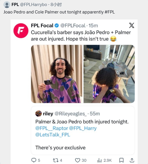 首发公布8个多小时前,库库雷利亚理发师就在社媒透露帕尔默和若昂·佩德罗将伤缺,还@其它博主称是独家,但他随后删除了相关内容。