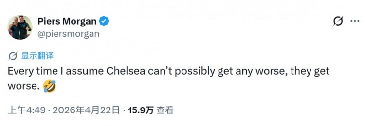 英国名嘴皮尔斯·摩根社媒写道:“每次我以为切尔西不可能更烂了,他们总是能突破下限。”
