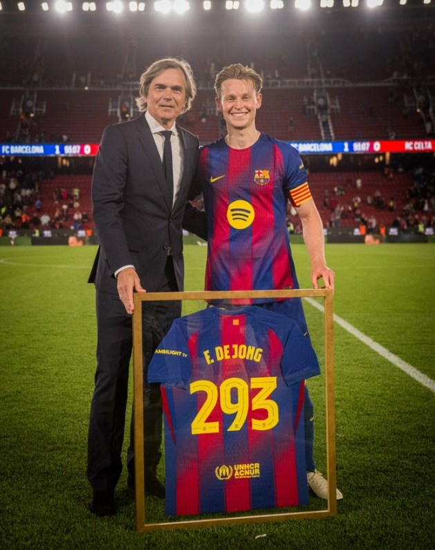 本场比赛德容替补登场,这是他第293次为巴萨出场,超越名宿科库成为队史出场最多的荷兰球员。赛后科库也为德容颁发了纪念球衣,并合影留念。