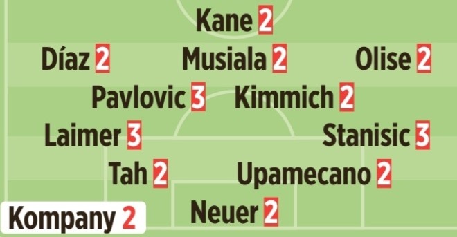 首发:凯恩2分/迪亚斯2分、穆西亚拉2分、奥利塞2分/帕夫洛维奇3分、基米希2分/莱默尔3分、若纳坦·塔2分、于帕梅卡诺2分、斯坦尼西奇3分/诺伊尔2分